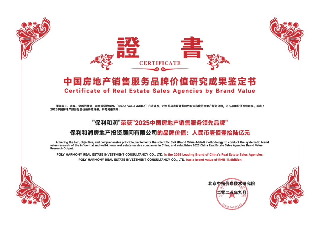 2025年9月11日,由中国企业评价协会、清华大学房地产研究所、北京中指信息技术研究院主办,北京中指信息技术研究院中国房地产TOP10研究组承办的“2025中国房地产品牌价值研究成果发布会暨第二十二届中国房地产品牌发展论坛”在北京召开。保利和润凭借其全产业链综合服务能力,构建了覆盖不动产开发、经营、服务全生命周期的生态体系。荣膺“2025中国房地产销售服务领先品牌”荣誉称号。