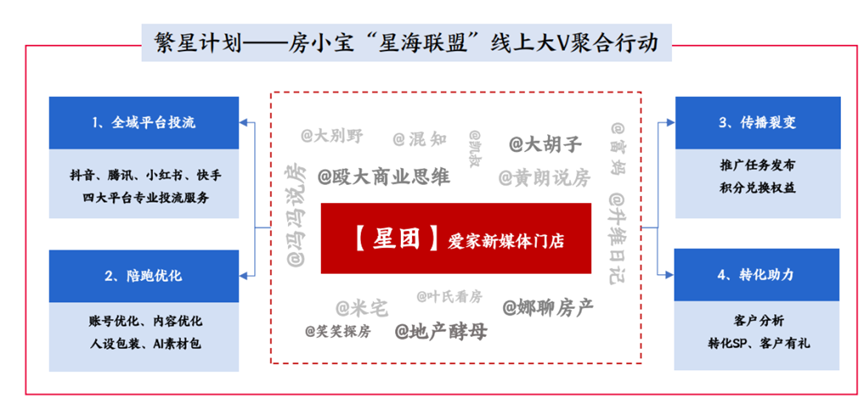 房小宝作为保利和润"大交易"战略的核心载体,通过"线上+线下"全渠道协同模式,为开发商提供精准获客与高效转化服务。房小宝启动"繁星计划"专注聚焦房产交易服务的数字化营销,通过构建"内容生产+流量运营+精准转化"的闭环生态。截止目前,保利和润MCN团队已成功运营超2600组账号,搭建了2000多个活跃直播间,全网粉丝量累计达到230W+,月均曝光量问问保持在1亿以上,为开发商拓展线上增量,实现跨域获客提供新路径。